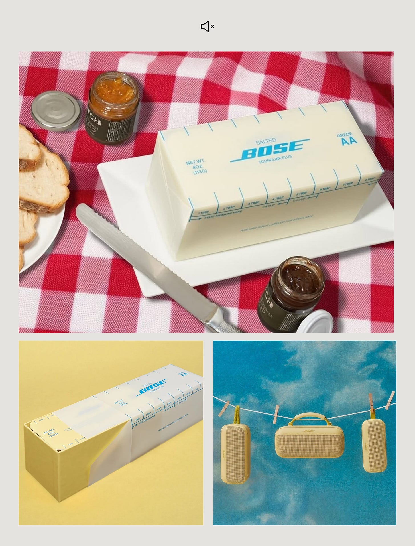 Bose ha envuelto su nuevo altavoz como si fuera una barra de mantequilla lista para la tostada. La mantequilla era solo campaña, claro, pero el objeto es real: amarillo suave, portátil y resistente al agua. Me encanta esta campaña.